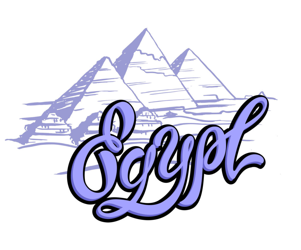 Travel. Design for the tourism industry. Trip to Egypt. The City Of Giza. Lettering. A sketch of the pyramids. Vector illustration.
